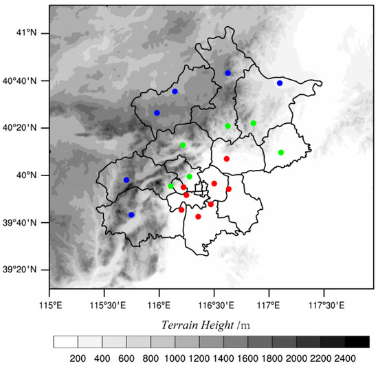Distribution of the 20 selected meteorological stations and topography of the Beijing area. The blue, green, and red circles in the figure correspond to the stations on the mountain, at the foot of the mountains, and plain areas, respectively.