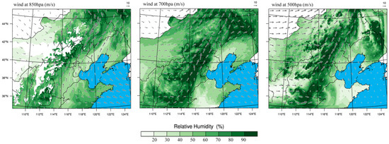 Atmospheric relative humidity and wind field at 850 hPa, 700 hPa, and 500 hPa in North China at 1200 UTC on 24 June 2012. The color map in the figure indicates the relative humidity, and the arrows show the wind field.