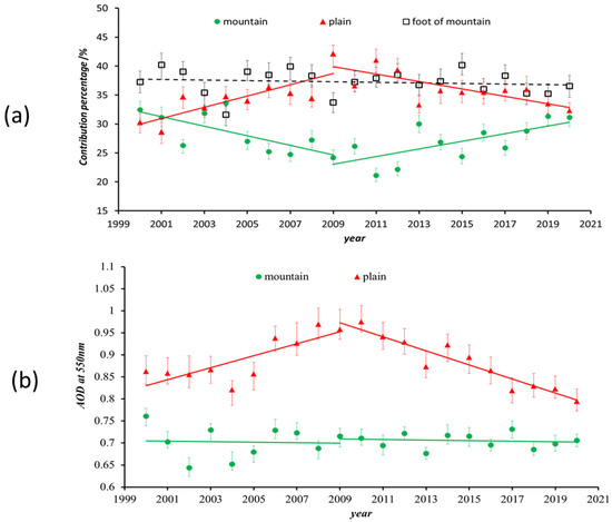 The PCR in plain and mountainous areas showed opposite trends, as seen in Figure 3a. The PCR in plain areas significantly fluctuated upward from 31% to nearly 40% from 2000 to 2009 before decreasing, finally approaching a level in 2020 similar to 2000. In contrast to the plain areas, PCR in the mountains initially decreased from 30% to ~24% (around 2010) and then increased to ~31% in 2020. The PCR for areas at the foot of the mountains showed no obvious change trend over the last 20 years, so we decided to ignore this element in subsequent analyses. As seen in Figure 3b, from 2000 to 2009 (especially after 2004), the AOD in the plains increased from 0.85 to 0.96, then gradually decreased to approximately 0.83 in 2020. The AOD value in mountainous areas fluctuated around 0.7 for all 20 years.