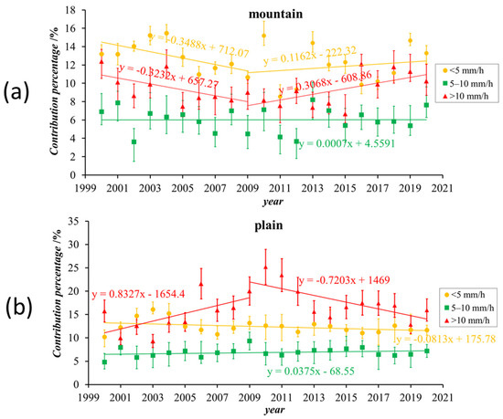 To further analyze the impact of different rainfall intensities in different regions on the contribution rate, hourly precipitation results from ground meteorological stations in mountainous and plain areas were divided into three categories according to the precipitation intensity, i.e., less than 5 mm h−1, 5–10 mm h−1, and >10 mm h−1. Figure 4 shows the contribution rates of different rainfall intensities in different regions. For plain areas, the curves shown in Figure 4b indicate that heavy rainfall changes (greater than 10 mm h−1) caused most of the PCR changes shown in Figure 3a. This implied that increased air pollution led to increases in heavy precipitation, which led to the total precipitation increase in the plain areas. Figure 4a shows the annual PCR variation at different rainfall intensities in mountainous areas. The PCR trend in the mountains shown in Figure 3a corresponded to the variation of precipitation in mountain areas and implied the change was primarily due to rainfall intensity changes of less than 5 mm h−1 and greater than 10 mm h−1.