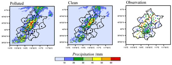 This study chose precipitation that occurred on 24 June 2012. We checked the simulated precipitation results by using data from 245 rain gauge stations (data from http://web.dataportal.bepk.cn/weatherServer/index.jsp; accessed on 1 May 2016). Figure 5 shows the total amount and distribution of precipitation from 0400 UTC to 1800 UTC on 24 June. The Polluted simulation captured the total rainfall features better than the Clean simulation. As shown in Polluted and Observation, the rainfall center was distributed in a belt along the foot of the mountains from southwest to northeast. The maximum cumulative precipitation exceeded 60 mm, and the cumulative precipitation in the mountain area was less than 30 mm. The simulated rainfall in the plain area Polluted simulation was ~5 mm lower than the observed results, but the distribution matched the actual situation well, while the Clean case just showed an isolated rainfall center at the foot of the mountains in the north. Compared with the Polluted scheme, the total rainfall in the plains and mountainous areas of the Clean simulation decreased. Therefore, we think that simulation results from the Polluted scheme better reflect the actual process.