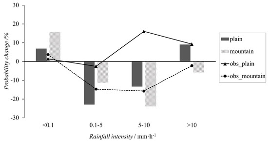 Different probabilities of the occurrence of the classified rainfall intensities under polluted conditions compared with clean conditions in plain and mountainous areas of Beijing. The histogram represents the simulation results for plain (black) and mountain (grey grid) areas, and the line with triangles and circles indicates the observed results for plain and mountain areas, respectively.