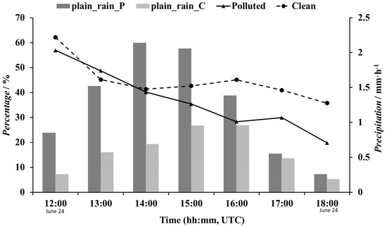 The histogram in Figure 7 shows the average hourly precipitation in plain areas. Plain_ rain_ P corresponds to polluted conditions, and plain_ rain_ C indicates clean conditions. Plain_rain_P was significantly higher than plain_rain_C, which once again confirmed that pollution increases also increased rainfall intensities in the plains. The line diagram in Figure 7 shows the PM2.5 mass ratio between the mountains and plains under polluted and clean conditions at the same time, which reflects the proportion of aerosols moving from the plains to mountainous areas. The gap between the two lines is not obvious in the initial stage of precipitation (before 0600 UTC on 24 June). As the rainfall system developed, the ratio for the Polluted case gradually decreased from 40% (0600 UTC on 24 June) to 22% (1000 UTC on 25 June), while the values for the Clean case fluctuated between 45% and 38%. Previous studies showed that heavy precipitation very effectively removed atmospheric pollutants, while the removal efficacy of weak precipitation was quite minor [2,3]. Therefore, we believe that air pollution increases rainfall intensities in plains areas, which also improves the removal of air pollutants, reduces the number of pollutant particles transported into mountain areas, and subsequently alters the precipitation characteristics in mountainous regions.