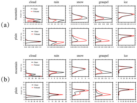 Vertical profiles of cloud microphysical parameters (a) mass concentration and (b) number concentration in Beijing plains and mountainous areas under Polluted (red line) and Clean (black line) conditions. Data were averaged for the main rainfall period (1200 UTC to 1800 UTC on 24 June). The unit of mass concentration in Figure 8a is 0.1 g·kg−1 for mountain areas and g·kg−1 for plain areas. The unit of number concentration in Figure 8b for cloud drops is 1 × 106 #·kg−1, and the units of number concentration in Figure 8b for rain, snow, graupel, and ice are 1 × 103 #·kg−1.