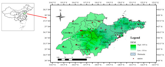 Shandong Province is located on the east coast of China and covers an area of 158,000 km2 (Figure 1). Its eastern part protrudes between the Bohai Sea and the Yellow Sea, while the western and northern parts are on the North China Plain. There is a large difference between seaside cities and inland cities, which is reflected in the level of urban development and meteorological factors.