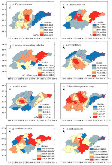 From the Shandong Provincial Bureau of Statistics, we retrieved yearly data on the urbanization rate and increases in secondary industry and soot emissions. We also retrieved the daily data on the temperature range and sunshine hours from the China Meteorological Data Network. Figure 2 shows the distributions of SO2, the urbanization rate, secondary industry, precipitation, wind speed, diurnal temperature range, sunshine duration, and soot emissions in Shandong. The quarterly and annual data related to the influencing factors were calculated and used in the research.