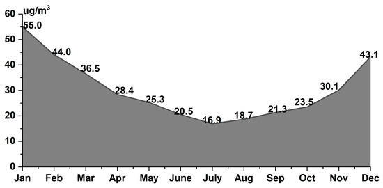 The average concentration of SO2 from 2014 to 2019 was high in inland areas and low in coastal areas, and the maximum concentration appeared in the transition area between the peninsular and the inland areas of Shandong (Figure 2). The SO2 concentration during the six years followed an obvious monthly pattern: the maximum value appeared in January, and the minimum value appeared in July (Figure 3). The maximum value was more than three times larger than the minimum value.