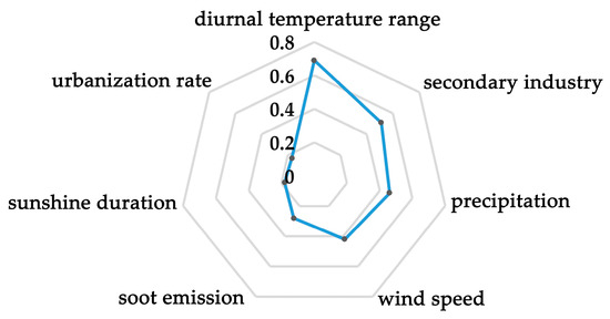 The factor detection of the geographical detectors processed the six-year data and obtained the following results (q value): diurnal temperature range, secondary industry, precipitation, wind speed, soot emission, sunshine duration, and urbanization rate (Figure 4). The interaction detection shows that the interactions among all the factors were in two states: bilinear enhancement and nonlinear enhancement. Bilinear enhancement was reflected between the diurnal temperature range and all the other influencing factors, between secondary industry and precipitation, between secondary industry and wind speed, and between precipitation and wind speed. All pairwise relationships among the remaining factors were nonlinear enhancements.