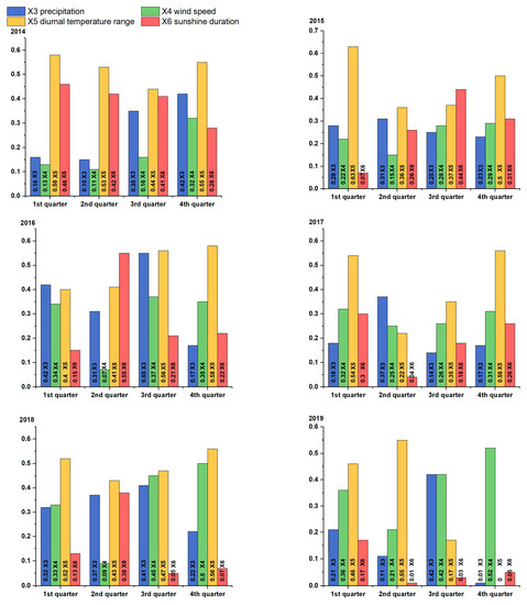 Quarterly factor detection results from 2014 to 2019. X3: precipitation; X4: wind speed; X5: diurnal temperature range; X6: sunshine duration.