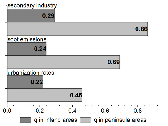 The detection results showed that there were significant differences in the human activity factors between the peninsular areas and the inland areas. The q values of the urbanization rates, secondary industry, and soot emissions in the inland areas and the peninsular areas are shown in Figure 6. All the q values in the peninsular areas were greater (two or more times) than those in the inland areas.