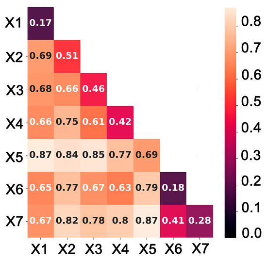 Interaction detection results. X1: urbanization rate; X2: secondary industry; X3: precipitation; X4: wind speed; X5: diurnal temperature range; X6: sunshine duration; X7: soot emission.