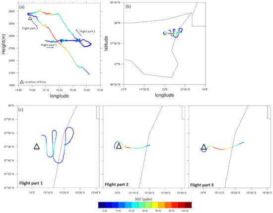Vertical (a) and horizontal (b) tracks of the ATR-42 ETNA13 flight (STRAP project) showing the measured SO2 (ppbv) concentrations. In addition to (b), the sub-panels in (c) illustrate the three distinctive legs (flight parts) of the aircraft’s trajectory (see Section 2.3 for more details). The black lines are geographical borders of the Sicily Island, Italy.