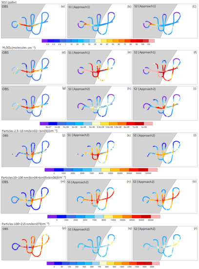 Evolution of SO2 concentrations (a–c), (H2SO4) (d–i), ~2.5–10 nm-sized newly-formed particles (N2.5–10) (j–l), 10–100 nm-sized particles (N10–100) (m-o), and ~100–200 nm CCN-sized particles (N100–200) (p–r) along the aircraft trajectory, using the analysis Approaches 1 or 2 (see Section 2.3). OBS corresponds to the measurements obtained during the flight ETNA13 (10:45–11:15 UTC). S1 and S2 correspond to simulations that respectively use the activation parameterization for nucleation and the NPN.