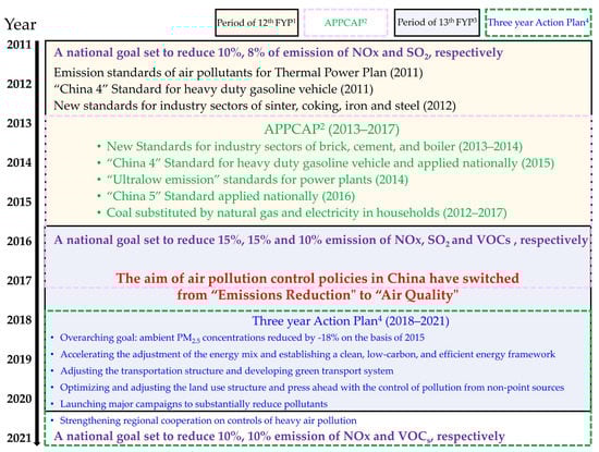 In addition to the FYP, China has achieved remarkable results in air pollution controls with the implementation of the clean air policies. The detailed major clean air policies are summarized in Figure 1. For example, the “Air Pollution Prevention and Control Action Plan” (APPCAP, covering 2013–2017) was the most stringent air pollution prevention and control action plan promulgated in China. During this period, the PM2.5 concentrations in the BTH, YRD, and PRD regions in 2018 relative to 2013 decreased by 25%, 20% and 15%, respectively [29]. In the five years, China had taken a series of strict air pollution control actions. However, there was a lack of control measures for the NMVOC emissions. Since then, China’s State Council has promulgated the “Three-Year Action Plan for Winning the Blue Sky Defense Battle”. By 2020, the total emissions of SO2 and NOx would be reduced by more than 15% relative to those in 2015. It is expected that air quality can be significantly improved through the implementation of air quality policies. Despite China’s efforts to reduce emissions, China’s air quality was still far below the requirements of residents and the targets promised by the government. Therefore, flexible and scientific emission reduction policies are needed to prevent the deterioration of air pollution in China.