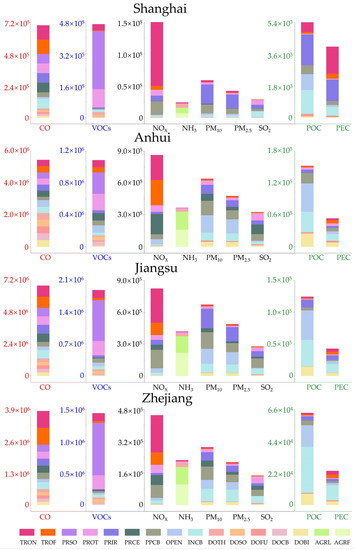 The histogram of 16 sectors of annual emissions in 2018 for each species (CO, VOCs, NOx, NH3, PM10, PM2.5, SO2, POC and EC) in Shanghai, Anhui, Jiangsu, and Zhejiang in the YRD. The unit of emission is tons/year (t/a). The descriptions of 16 emission sectors were listed in Table S1.
