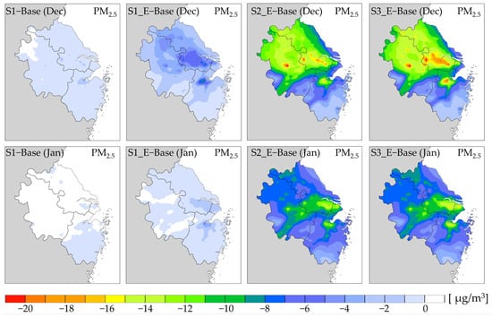 Compared to the control scenarios of S1 and S1_E, the enhanced emission control scenarios (i.e., S2_E and S3_E) are expected to further reduce PM2.5 in each city by more than 20%, depending on the regions and months (see Figure S4). For example, the S3_E control scenario led to a further decrease in monthly average PM2.5 concentrations in Shanghai, Anhui, Jiangsu, and Zhejiang in December of 2025 by −3.1, −14.9 to −3.6, −17.3 to −2.6, and −12.6 to −3.4 μg/m3 in December of 2025, respectively (Table S4). The predicted decreases in PM2.5 in January were different from those in December, with smaller decreases expected in the most areas of the YRD due to their lower PM2.5 concentrations (Figure 3 and Table S5). It was clear that when the precursor reductions were high, it would lead to a concentration decrease in more areas with higher reductions (Figure 3). Compared with the S2_E scenario, the monthly average decreases in PM2.5 in the YRD region for 2 months under the S3_E scenario were larger. For example, reductions were expected to decrease further by 8.3 μg/m3 in Hangzhou and Anqing under the S3_E scenario, with more decreases in most other cities (Tables S4 and S5). In summary, the decrease values of the emission control policies predicted by the S1 and S1_E scenarios were not enough, and the decreases in city mean PM2.5 concentrations in the most regions of YRD in the winter of the 14th FYP were less than 20%, based on the monthly simulation results (Figure S4). As shown above, the enhanced emission control scenarios (i.e., S2_E and S3_E) will be an effective way for decreasing PM2.5 in the YRD region.