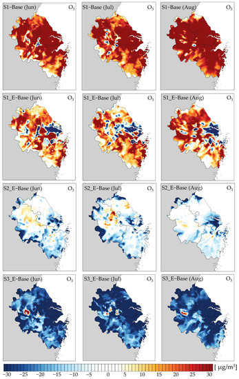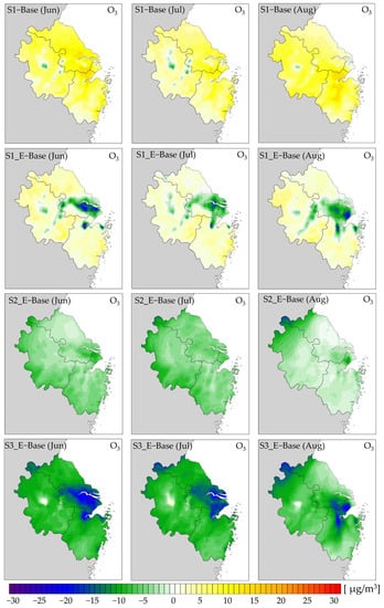 The spatial distributions of O3 change values under the S2_E and S3_E scenarios relative to the base case in Figure 4 and Figure 5 revealed that the decreases in city hourly and MDA8 O3 mean concentrations in almost all the cities in YRD were found by controlling high-emission industries. Under the S2_E scenario, the maximum decreases in city mean O3 concentrations in Shanghai, Anhui, Jiangsu and Zhejiang were predicted to be −12.2 μg/m3 (in July in Shanghai city), −14.3 μg/m3 (in July in Hefei city), −15.8 μg/m3 (in July in Suzhou city), and −17.6 μg/m3 (in July in Taizhou city) μg/m3, respectively (see Tables S6–S8). Under the S2_E scenario, the average decrease values of MDA8 O3 concentrations in Anhui, Jiangsu and Zhejiang were −24.5 μg/m3 (in June in Suzhou city), −26.3 μg/m3 (in August in Changzhou city), and −18.2 μg/m3 (in July in Jinhua city) μg/m3, respectively (see Tables S9–S11). The higher O3 concentration abatements were found under the S3_E scenario relative to the S2_E scenario as shown in Figure 4 and Figure 5. In general, the largest drops of ozone concentrations were predicted under the S3_E scenario because of its highest control strength of precursors. The maximum average decrease values of city mean MDA8 O3 concentrations were −69.7 μg/m3 (in August in Huainan city) in Anhui, followed by −52 μg/m3 (in June in Suqian city) in Jiangsu, −51.2 μg/m3 (in July in Lishui city) in Zhejiang, and −19.6 μg/m3 (in July) in Shanghai under the S3_E scenario relative to the base case (see Tables S9–S11). It is noteworthy that the S2_E and S3_E scenarios gained more decreases in city mean MDA8 O3 concentration decreases than those for hourly O3 concentrations.