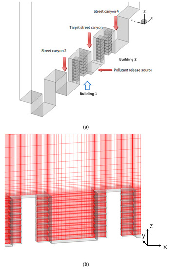 A single-side ventilation model and cross ventilation model are set up for studying their impacts on natural building ventilation as well as their influences on the diffusion of the outdoor air pollutants to indoor environments. Figure 2a illustrations the full-scale street canyon models employed in this study. The 2D street canyons consist of five uniform residential building models and four canyons, with the building height (H) = 24 m and the street width (W) = 24 m. The aspect ratio (AR = H/W) is 1. The target area is the third street canyon and the buildings on the two sides. The CO emission source is set in the target street canyon with 0.5 m in height and 16 m in width. The distances of the emission source to the buildings are set as 4 m on both sides. The two target buildings are named as Building 1 and Building 2, as shown in Figure 2a. Other buildings at the upstream and the downstream are employed for representing the impacts of the roughness elements and getting well-developed turbulence [54,55,56,69].