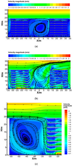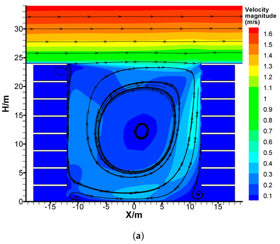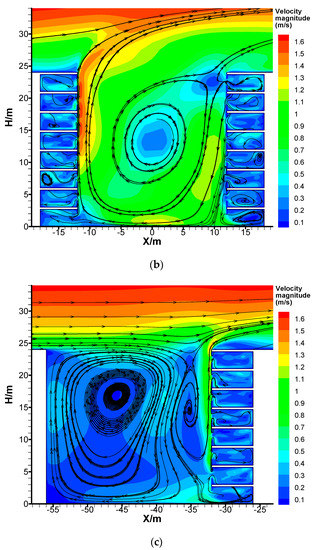 The streamline and flow in street canyons with cross-ventilated buildings are illustrated in Figure 5. With idealized isothermal conditions (Figure 5a), the flow pattern in the target canyon is a single-vortex type. The vortex occupies the full canyon, and its upper edge is at the same height with the canyon top. The air mass can flow across neighbouring canyons through the top floors of buildings owing to the cross ventilation. The velocity of the indoor airflow in the top floors of the buildings is significantly increased. Nevertheless, the influence on the airflow in the lower floors is negligible. Figure 5b presents the streamline and flow in the target canyon. As the results of the cross-ventilation mode and the downdraft in canyon 2 displayed in Figure 5b,c, the air mass in canyon 2 can flow into the target canyon through each building floor. The spilling indoor air mass from each floor slops upwards on both buildings in the target canyon, converging to a main updraft and flowing to the lower reaches on the upper layer of the canyon. Owing to the large upward velocity on both sides, no downdraft forms in the target canyon. Therefore, the vortex in the target canyon fails to construct.