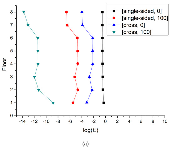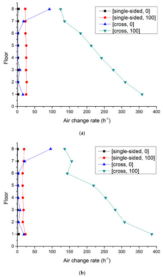 The ventilation conditions in both sides of Building 1 are presented in Figure 6a,b. ACH of different floors in Case [single-sided, 0], Case [single-sided, 100], Case [cross, 0] and Case [cross, 100] have good consistency. Indoor heating significantly increases ACH in all cases. The enhancement of the single-side ventilation is about 20 per hour, and the increased ACH at different floors have little differences. With a cross-ventilation mode and isothermal condition, similar ACH appears on Floor 1–6. While on Floor 7 and Floor 8, ACH increases rapidly. Indoor heating in the cross-ventilation scenario dramatically increases ACH even by two orders of magnitude. The enhancement is strengthened with the lower down floors.