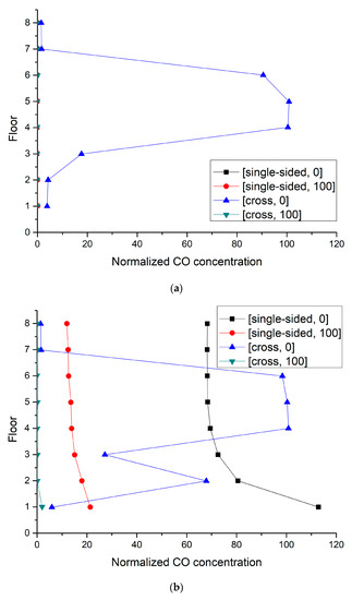 Normalized CO concentration at different floors in (a) windward side of Building 1, (b) leeward side of Building 1, (c) windward side of Building 2, and (d) leeward side of Building 2.