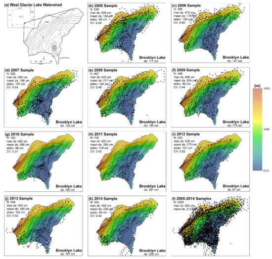 (a) Topographic map of West Glacier Lake watershed. Snow depth sample locations and summary statistics for sample year (b–k) 2005 to 2014, and (l) all year locations (n = 3382).