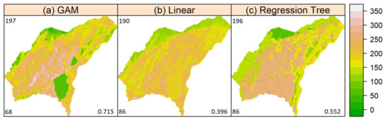 In this study, we compared three commonly used interpolation methods (binary regression tree, multiple linear regression, and generalized additive models) that are applied in snow depth distribution research. The binary regression tree (BRT) method and multiple linear regression (MLR) models were selected for ease of calculation, interpretation of results, and due to previous success in snow distribution studies [5,7,13,42,45,57]. Generalized additive model (GAM) methods were selected for the ease of calculation, the ability to capture non-linear interactions, and due to previous success in snow distribution studies [27,28,46,58]. More details on these methods are provided in Appendix B. Models with the lowest deviance and highest coefficient of determination (r2) were selected.