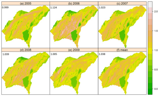 The patterns of snow depth distribution were similar from year to year, with the deepest snow on the east facing slopes and the shallowest snow on the west facing slopes (Figure 3). The five years of SDV data (Figure 3) were used to develop the CSDP (Figure 3f) by calculating the arithmetic mean of five SDV grids. The Monte Carlo analysis provided a sensitivity of the normalized basin mean snow depth (1.038). This mean snow depth was within 1% yet estimated a larger range in SDV variability. The snow depth pattern repeatability was computed with the Pearson’s correlation coefficient (r) for the CSDP versus individual years SDV (Figure 4). This pattern repeatability ranged from 0.78 to 0.88 with a mean of 0.83 (Figure 4). This is within the range of 0.70 to 0.89 reported by Pflug and Lundquist [10]. A highly correlated pattern repeatability is important since it indicates that the estimated CSDP can be used to simulate the distribution of snow depth patterns with a reasonable degree of confidence [10,16].