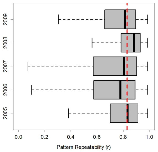 Using multiple years in the GAM framework yielded consistent results in terms of the fit statistics (Table 3). The statistics were not quite as strong as the GAM model with the 2006 data (Figure 2a). The correlation between residuals and the topographic parameters (listed in Table 2) were small (Table 3). The best correlation was between the four-year model omitting 2006 and elevation (r = 0.29; Table 3; Supplementary Materials, Figure S2). All other correlations were smaller than 0.2.
