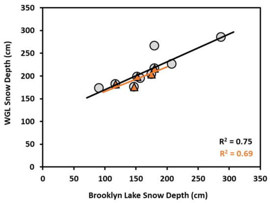 The WGL winter season index was estimated from the Brooklyn Lake snow depth data (see Supplementary Materials, Figure S3) and their correlation to mean annual measured snow depth. Brooklyn Lake snow depth and the WGLW measured snow depth mean were correlated for (a) the ten measurement years (r2 = 0.75) and (b) the five calibration measurement years (r2 = 0.69) (Figure 5). The correlation between the Brooklyn Lake snow depth and the WGLW measured snow depth mean (Figure 5 was used as the winter season index since the correlation was high (r2 = 0.75). For snow depth, five of the survey dates occurred during above normal (median) years, five during below normal years, one (2011) was above the 90th percentile, and one (2012) was below the 10th percentile.