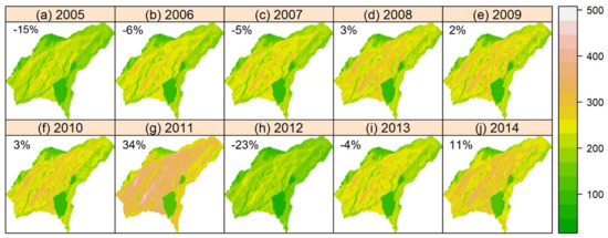 The estimated distribution of snow depth for the 10 study years: (a–j) 2005 to 2014, where snow depth was sampled at approximately the time of peak snow accumulation. The percent difference from the 10-year mean snow depth (169 cm) estimated from the Brooklyn Lake SNOTEL snow depth sensor is presented in the upper left of each figure.