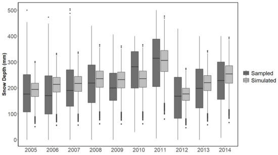 The modeled basin mean snow depth was deeper than the measured depth (Figure 7) for the five years with the most measurements (2005 to 2009; Table 1) and in three other years (Figure 7). In the two other years (2010 and 2011), the snow depth measurements were concentrated at lower elevations (Figure 1g,i). Sampling year 2011 had a deep snowpack and, although the fewest points were collected, the mean modeled snow depth was only slightly larger than the measured snow depth (Figure 1). Sampling year 2012 also had the next fewest number of measurements but included samples at high elevations within WGLW (Figure 1i); thus, it yielded a better estimated basin mean compared to the observed mean (Figure 7). There is a positive bias of the basin mean snow depth estimated when measurements do not adequately cover the range of elevations across West Glacier Lake (Figure 1 and Figure 7), supporting the need for a model development/evaluation based on 2005 to 2009 alone, when the data are better distributed.