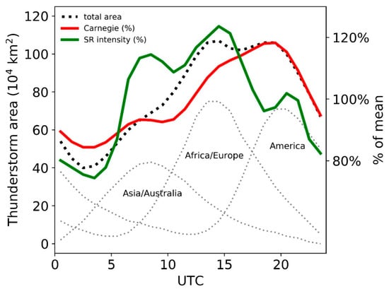 Comparison of the diurnal UT variations of thunderstorm surface area worldwide [] and the UT variation of electric potential gradient over the ocean (Carnegie curve), calculated as percentage of the mean using annual values reported in Harrison []. The cumulative relative intensity of the first three SR modes of the Ez field component observed at Nagycenk (NCK), Hungary, for the period 1994–1998, follows a similar general diurnal trend and exhibits three maxima which correspond to the three major sources of tropical thunderstorms. The peaks in the SR amplitude are better resolved in autumn and winter, when the influence from local thunderstorm activity at the observatory is lower [].