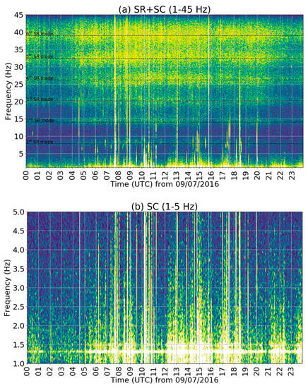 The analysis of the raw data is initially made in the frequency domain to identify the dominant natural sources of background variability in the 1-45 Hz electric field. Dynamic spectrograms using the Welch method [] are created for sample fair-weather days from midnight (00 UT) to midnight of the following day. The Welch’s method computes an estimate of the power spectral density by dividing the data into overlapping segments, computing a modified periodogram for each segment, and averaging the periodograms. Daily spectrograms are computed using 100 s (10,000 points) intervals of filtered data and applying a 4096-points Fourier transform to produce 864 1-D spectra plots per day. Figure 2 shows an example of a spectrogram (frequency window: 1–45 Hz) from 9 July 2016. The SR modes are resolved in this graph as persistent horizontal bands of enhanced power centred roughly around 8, 14, 20, 26, 32, and 38 Hz (Figure 2a). SR can therefore be considered as a major source of output current in fair weather, aside from local turbulent SC which instead largely dominates below 5 Hz (Figure 2b). The SC effect is largely dependent on surface wind speed and influenced by different weather conditions. Yet, it can increase during advection of pollutants from surrounding cities and sea salt aerosols at the site. The variability of 1–3 Hz band of the antenna current was previously used as a proxy for near-surface turbulence during March 2015 solar eclipse by Bennett []. Some additional transient disturbances are visible as thin vertical lines. These artifacts are normally associated with occasional high amplitude but short duration noise from charged feathers of birds flying nearby the sensor or electrical interference at the installation site.