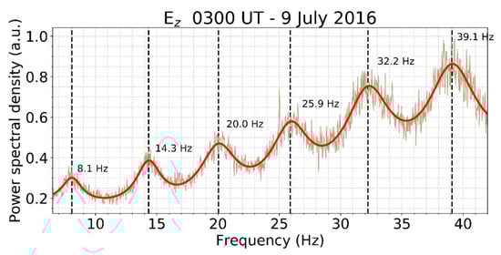 A typical example of the SR electric component raw amplitude spectrum taken from the BTD is given in Figure 3. The spectrum is computed using an FFT algorithm on filtered data in the frequency interval 5–45 Hz. The SR peaks up to the 6th mode are distinctly detected in fair weather and in the absence of relevant manmade interference. The principal parameters of each mode, such as modal frequency and relative peak amplitude, can be estimated by least-squares fitting of the experimental spectrum with the sum of 6 Lorentzian functions (red line in Figure 3) of the form: