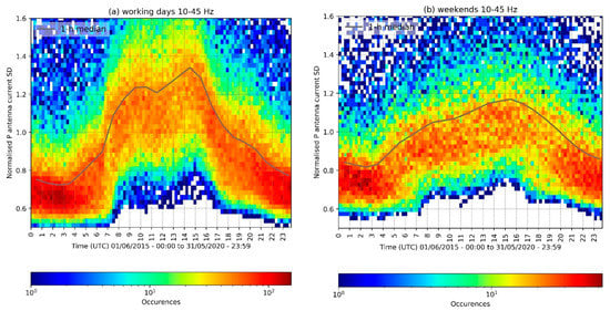 Diurnal variation of the standard deviation of current induced on the antenna in the 10–45 Hz frequency range (1 June 2015–31 May 2020) during (a) working days (Mon–Fri) and (b) weekends only (Sat–Sun), represented as a 2-D histogram with 15-min temporal resolution (96 bins in each dimension). The solid curve indicates the trend of interpolated hourly median SD values.