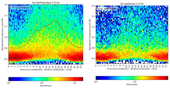 Diurnal variation of the standard deviation of current induced on the antenna in the 1–5 Hz frequency range (1 June 2015–31 May 2020) during (a) working days (Mon–Fri) and (b) weekends only (Sat–Sun).
