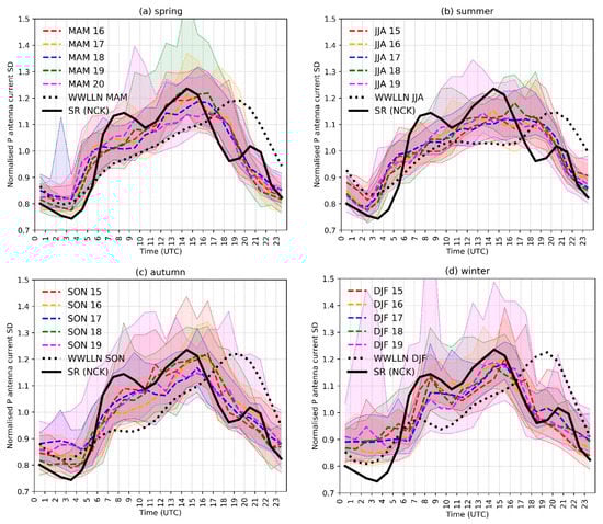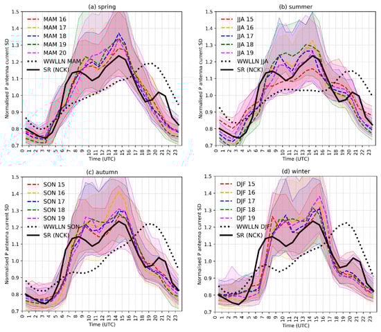 Seasonal diurnal variation (all days) of the standard deviation of current induced on the BTD-300 primary antenna in the 10–45 Hz frequency range (1 June 2015–31 May 2020). The normalised 1-h resolution median lines (dashed) are superimposed to the interquartile range (shaded area). The observed trend is compared with the seasonal diurnal variation of global thunderstorms derived from WWLLN data (2012–2013) [] (dotted) and the cumulative intensity of the first 3 SR modes measured at NCK observatory (1994–1998) [], both normalised by the mean.
