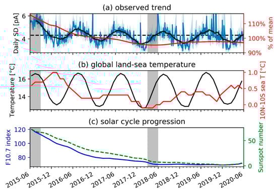 The presence of SR power and frequency inter-annual variability has been found to emerge from a complex interplay of global land-ocean temperature changes, related convective rainfall and lightning intensity variation, and the solar cycle progression. Evidence of such long-term modulation is clearly seen also from the BTD measurements taken at Portishead. Figure 8 shows the observed trend in the daily antenna median SD amplitude, represented as the blue solid line which is superimposed to the interquartile range calculated for each day (light blue shaded area). The rolling mean, calculated with a 30-point window convolution filter (black line), exhibits an unambiguous annual oscillation that is a manifestation of the annual global surface air temperature (Figure 8b) changes (~1.5–2 °C) determining variation with the same period in the global lightning activity, and accordingly in the SR signal amplitude. The maximum peak in the SD occurs during the northern hemisphere summer (JJA), where most of the continental landmasses are distributed, and coincides with the maximum lightning intensity recorded globally []. Hayakawa et al. [] reported a strong correlation between periodic variations of SR intensity recorded at Moshiri (Japan) and global surface temperature in the ±45° latitude band. Similarly, the BTD output signal in the SR band is found to oscillate in-phase with the combined global land-sea temperature from NOAA’s National Climatic Data Center, indicating a cross-correlation coefficient of about 0.9, that is consistent with the result found by Sekiguchi et al. [] using magnetic field data. Yet, it is worth noticing that the SD amplitude annual oscillations are not stationary but show evidence of an overlapped inter-annual trend. This trend is extracted from the SD daily medians, applying a seasonal decomposition technique [] to decompose the time series into three additive components (trend, seasonal and residual). The observed inter-annual trend (solid red line in Figure 8a) decreases between June 2015 and June 2018, which corresponds to the SD extrema (maximum and minimum, respectively) recorded during the 5-year period, and subsequently becomes nearly constant. An exceptional increase of the SR intensity for the period 2015/2016 has been documented by other studies, that considered the SR modes average peak frequency and intensity measured at various observatories distributed globally [,,]. In analogy with other SR amplitude observations taken at similar mid-high latitudes (i.e., Eskdalemuir []), the steady decline in the inter-annual SD is found to be in phase with the transition from the maximum to the minimum of the 11-year solar cycle (Figure 8c). Satellite observations do not show a solar phase-related variation in the intensity and distribution of global thunderstorm activity (i.e., the primary origin of SR) []. Solar cycle-related long-term changes in the SR frequency and power are thus attributed to the modification of the earth-ionosphere medium, and in particular to a reduction of local ionospheric height resulting from increased solar X-rays and energetic electron precipitation (EEP) near to periods of maximum solar activity [,]. In the absence of data covering an entire solar cycle, however, a univocal interpretation of the long-term trend observed in the BTD data is still challenging. Intrinsic source changes associated with other global climate drivers may in fact play a significant role in the inter-annual SR variability observed worldwide. A qualitative agreement is actually found when looking at the evolution of the 10 N–10 S ocean temperature anomaly for the same period (Figure 8b), indicating a possible SR (and in turn the antenna current) response to global climate effects on major lightning sources.
