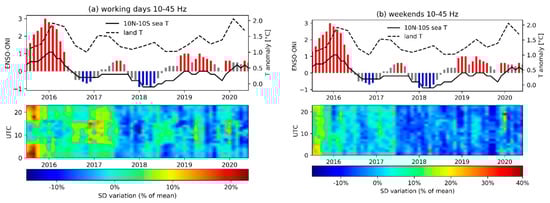 The patterns seen in the time-UT anomalies of SD amplitude plot for the 10–45 Hz band show a noticeable increase (~20–30% of the mean) during the summer months of 2015, while approaching the peak of the exceptional 2015–2016 warm ENSO episode, which culminated in the maximum ocean temperature anomaly recorded for the entire period considered. The subsequent decrease to values lower than about 0.5 °C in the 10 N–10 S SST anomaly, coincided with a substantial transition to negative SD anomalies, which is particularly evident from the second half of 2017, during the months that preceded the 2018 cold ENSO phase. Similar enhancements/diminutions in the SD amplitude would require more specific analysis, combining measurements from other observatories and including global convective rainfall and lightning data. Yet, if confirmed by future studies, the amplitude and time of occurrence of such anomalies in the SD may be used as a proxy of complex global scale relationships with ENSO, revealing changes in lightning frequency and distribution pattern in specific areas of the globe. The necessity of choosing an ideal site for such measurements is further highlighted in Figure 9a, where it is shown that the increased daytime local variability during working hours may mask eventual diurnal SD anomalies otherwise seen in the weekend data. Such effect is observed, for example, during JJA 15.