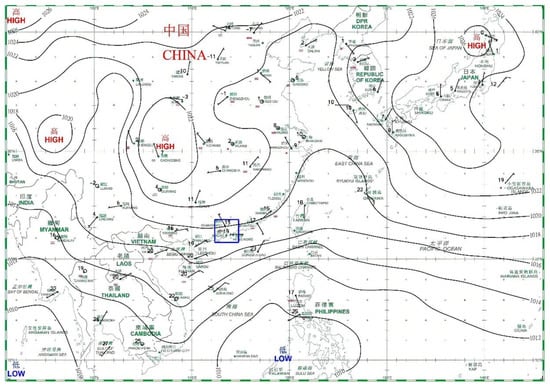 Based on the synoptic situation (Figure 1), temperature and wind observations from 1441 surface automatic weather stations (AWS, the location of AWS is indicated in Figure 2), a typical sea breeze process in the PRD on 27 December 2020 was selected for simulation. The land heating effect and the extension inland of the sea breeze reached the maximum in December of that year. Figure 1 shows the surface weather chart of the Hong Kong Observatory on 0800 LST 27 December 2020 (https://www.hko.gov.hk/sc/wxinfo/currwx/wxcht.htm (accessed on 21 December 2021). Note that local times are used in this paper). This process is mainly influenced by a cold high pressure over the mainland of China and a Philippine cyclone. The PRD region is in the front of the high pressure and controlled by the northeast monsoon, with fair and less cloudy weather occurring over PRD. As the cold high pressure weakened and moved eastward it reached a minimum of 1018 hPa at 1400 LST on the 27th, which were favorable for the generation of UHIC and the development of sea breezes []. Subsequently, the high pressure at 2000 LST was intensified and caused an intrusion of easterly winds and the cease of the sea breeze.