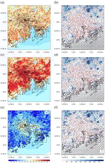 For winds, CTRL captured the observed initial development of the sea breeze circulations over the PRE and the east and west coasts of PRD at 1200 LST and a plain–mountain circulation generated near the major peripheral mountain (Figure 2b). At 1600 LST, the model simulated the sea breeze propagating from the west coast of PRE to the junction of Jiangmen and Zhongshan and those from the east coast of PRE to the middle city of Shenzhen. Both agreed with the observation very well (Figure 2d). The model slightly overestimated the winds in the PRE region, possibly due to the land–surface parameterization approximation and the smooth topography in the WRF model []. At 2200 LST, the mountain wind circulation driven by the outer PRD mountains developed and became dominant in the region at 2200 LST, and the sea breezes tended to end in both observations and simulated results (Figure 2f).