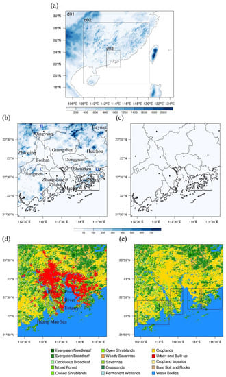 To investigate the influence of the mountainous topography and the urban clusters on sea breeze processes in the PRD region, the WRF version 4.2.1 (https://www2.mmm.ucar.edu/wrf/users/tutorial/tutorial_presentations_2021.htm (accessed on 16 December 2021)) was employed to simulate the sea breeze process from 1800 UTC on 25 December 2020 to 0000 UTC on 28 December 2020. The first 22 h in each simulation experiment were regarded as model spin-up time and discarded. The simulation domain was centered at (23.7, 114.7) with 150 (east-west) × 120 (north-south) horizontal grid points with a grid spacing of 15 km for the outer domain (d01), 451 × 421 grid points with a grid spacing of 3 km for the intermediate domain (d02), and 286 × 343 grid points with a grid spacing of 1 km for the innermost domain (d03). The vertical resolution included 46 layers. The MODIS_30s land-use type data were used to specify the model land surface. The topographic data (TOPO_30s) from WRF V4.2.1 were used to derive the terrain height for d01 and d02, and National Aeronautics and Space Administration (NASA) Shuttle Radar Topography Mission (SRTM) 3s data for d03. The National Centers for Environmental Prediction (NCEP) Final Analysis (FNL) data with a 1° by 1° resolution were used as the initial field and boundary conditions for the WRF models. The lateral boundary conditions and sea surface temperatures were both updated every 6 h. The WRF physical schemes adopted in this study included the Yonsei University (YSU) boundary layer scheme [], Noah land surface scheme [], Thompson microphysics scheme [], RRTMG longwave [], and RRTMG shortwave [] radiation scheme and Monin–Obukhov surface layer scheme []. The Grell–Freitas cumulus scheme [] was activated for the d01.