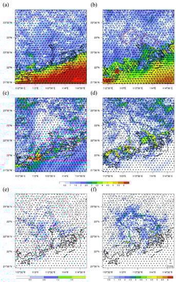 Previous studies demonstrated that urban heat islands (UHI) of coastal cities can influence regional circulation and modify the sea breeze driven by the temperature difference between land and sea []. Figure 4e shows that during the morning hours (1000 LST), the wind perturbations generated by urban heat island circulation (UHIC) in the PRD region were mainly located in the periphery of Foshan, Jiangmen, Dongguan, and Shenzhen. There was a 0.4–2 m/s convergent airflow towards city centers of the Foshan, Guangzhou, and Jiangmen, and 0.4–2 westerly and 0.4–1.2 m/s southerly winds over Shenzhen and Dongguan, respectively. The UHIC weakened the winds in front of the sea breeze and enforced the sea breeze moving deep inland.