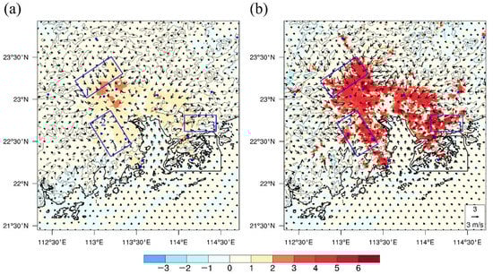 Likewise, the maximum intrusion distance of the northward propagation of the sea breeze on the western coast of PRD increased by 4 km. This is because the UHIC of southern Jiangmen and Foshan accelerate sea breezes. In addition, although the Foshan–Guangzhou urban-rural wind circulation evidently (indicated by box 1 in Figure 5) blocked the sea breeze, this area is farther away from the coast and the UHIC was already weaker when it interacted with the sea breeze, so the overall UHIC performance was a boost to the sea breeze.