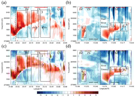 Hovmöller chart of 10 m wind component (unit: m/s) along the crossline AB (a,c) and CD (b,d) for CTRL (a,b) and NoUrb (c,d) experiment, the shaded in the left column is v component, and the right is u component, the time axis is 0800 LST 27 December to 0800 LST 28 December, the black dotted lines indicate sea and land boundary, the red dots are city underlying surface and the letters are abbreviated for cities. Solid boxes 1–3 and 5–6 are UHICs in Jiangmen, southern and northern Foshan, western and eastern Shenzhen, respectively. Box 4 is the West River breeze. The arrows indicate the flow moving directions in the plane.