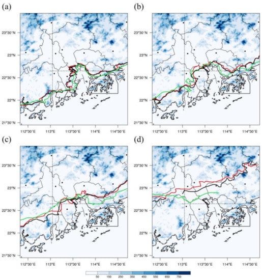 As for the urban effects, at 1200 LST (Figure 7a), the position of the sea breeze fronts of CTRL and NoUrb were almost identical. The urban effects were more pronounced at 1600 LST (Figure 7b). The position of the sea breeze fronts in CTRL was closer to inland than NoUrb. The urban heating island effect of 1–3 °C accelerated the propagation of the sea breeze (Figure 5a). On the west coast of the PRE, the sea breeze in CTRL moved slower. The reason is that the river breeze from the West River impedes the advance of the sea breeze (Figure 6b, explained in Section 3.3). At 1800 LST, the sea breeze on the east coast of the PRE in CTRL was retarded by the UHIC of Shenzhen (Figure 6b) and Dongguan (Figure 7c), taking approximately the same position as that of NoUrb. The UHIC of Jiangmen City on the west coast in the PRD promoted the penetration of sea breeze to inland (see Section 3.3) and made the CTRL sea breeze front advance a farther distance, as does the north coast (Figure 7c). At 2200 LST, the terrain effect promoted a southerly wind with a speed of 2–5.5 m/s in the PRE (Figure 4d), and the UHIC in the south of Foshan–Guangzhou enhanced the sea breeze. The combined effect of topography and city made the CTRL sea breeze at the northern coast of PRE farther into the north (Figure 7d). Obviously, the topography has much larger effects on the sea breeze than the urban agglomerations.