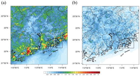 Twenty-four-hour mean RMSD of 10 m wind speed for NoTer (a) and NoUrb (b) compared to CTRL (from 0000 LST 27 December to 0000 LST 28 December 2020). The white dotted box in Figure 8a shows the location of PRE (113.19–114.166° E, 22.15–22.75° N).