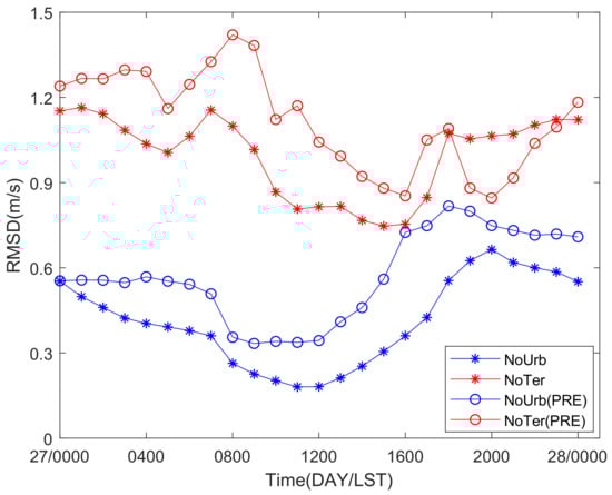 To quantitatively assess the overall wind disturbance by topographic forcing and urban agglomeration, the root mean squared difference (RMSD) of the wind speed for NoUrthe b and NoTer relative to CTRL was calculated separately for the whole day of the 27th (27th 0000 LST-28th 0000 LST) following