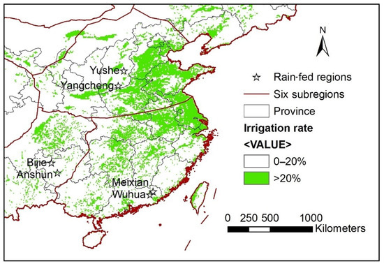 The typical rain-fed agriculture regions in North China, Southeast China, and Southwest China.